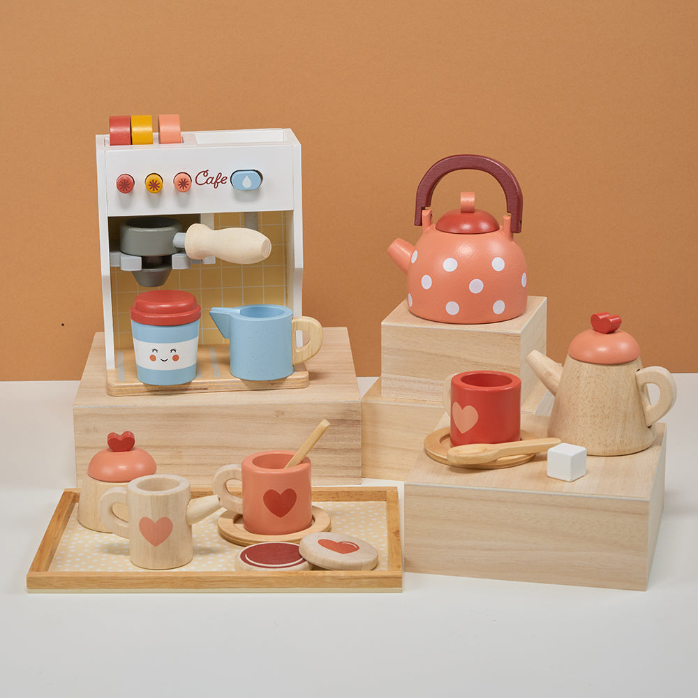 This wooden tea set toy includes a dotty tray, a toy teapot, 2 pretend cups saucers and spoons, a pretend sugar pot with lid, a pretend milk jug and 2 wood biscuits
